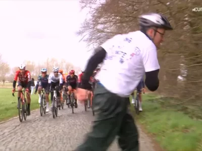 Um ativista climático meteu-se no meio da estrada e causou queda ao vencedor da edição de 2025 da Volta a Bruges, Juan Sebastián ...
