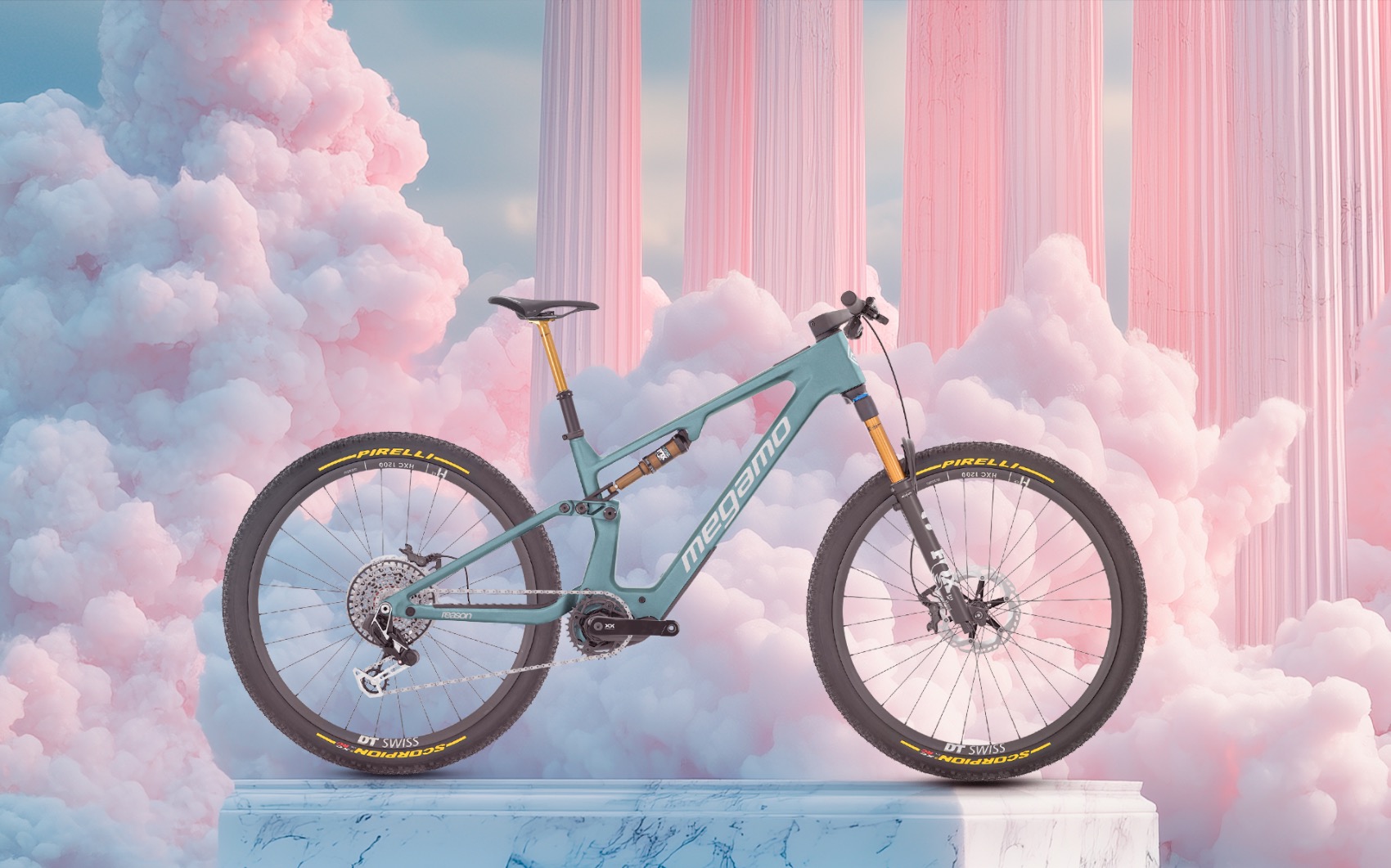 A gama Megamo Reason apresenta-se em várias opções, com quadros em carbono ou alumínio, recorrendo a suspensões FOX (36 Factory, Performance ou SL) e transmissões SRAM XX AXS, Shimano XT ou combinações XT/Deore. Estão disponíveis versões Enduro (160/160 mm) e Trail (140/140 mm), com geometrias distintas para cada finalidade.