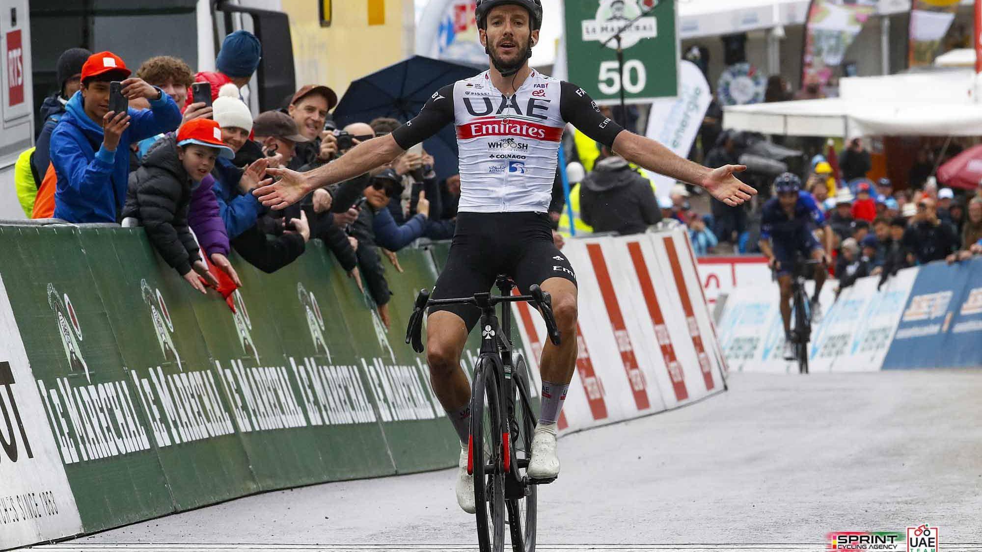 Partilha!X O britânico da UAE Emirates atacou dentro dos últimos cinco quilómetros da subida final, de categoria especial, depois do seu companheiro de equipa Juan Ayuso, camisola amarela, não ter resistido à sua falta de competição esta temporada. Adam Yates impôs-se ontem no alto de Thyon 2000, no final da quarta e penúltima etapa da Volta à Romandia, arrebatando a liderança da geral.PUB O britânico da UAE Emirates somou a segunda vitória da temporada, batendo o francês Thibaut Pinot (Groupama-FDJ), segundo, a sete segundos, e o italiano Damiano Caruso (Bahrain-Victorious) em terceiro, a 19 segundos. Adam Yates (@TeamEmiratesUAE) s'impose pic.twitter.com/zSD3cEWApX — Tour de Romandie (@TourDeRomandie) April 29, 2023 Yates, de 30 anos, isolou-se já dentro dos últimos cinco quilómetros e fez a subida até à meta, de categoria especial, contar a seu favor, conseguindo subir quatro postos para o primeiro da geral. Nesta tabela, o inglês parte para a etapa de hoje, a última, com 19 segundos de vantagem para o norte-americano Matteo Jorgenson (Movistar), segundo, e 27 para Caruso, outro dos beneficiados do dia de ontem. PUB Em sentido contrário esteve Nelson Oliveira (Movistar), que era quarto após o contrarrelógio da terceira etapa e cedeu, para o 27.º posto da geral, a 5.07 minutos do líder. Ivo Oliveira (UAE Emirates) segue em 111.º. Hoje, domingo, 170,8 quilómetros ligam Vufflens-la-Ville a Genebra, na quinta e última etapa, pouco acidentada e com reduzidas probabilidades de alterar os lugares finais no ‘top 10’ da geral. Classificações: www.procyclingstats.com Também vais quer ler… Nova jersey Vélodrome da Jumbo-Visma para o Tour já está disponível… [com vídeo] PUB Imagens: UAE Emirates Twitter