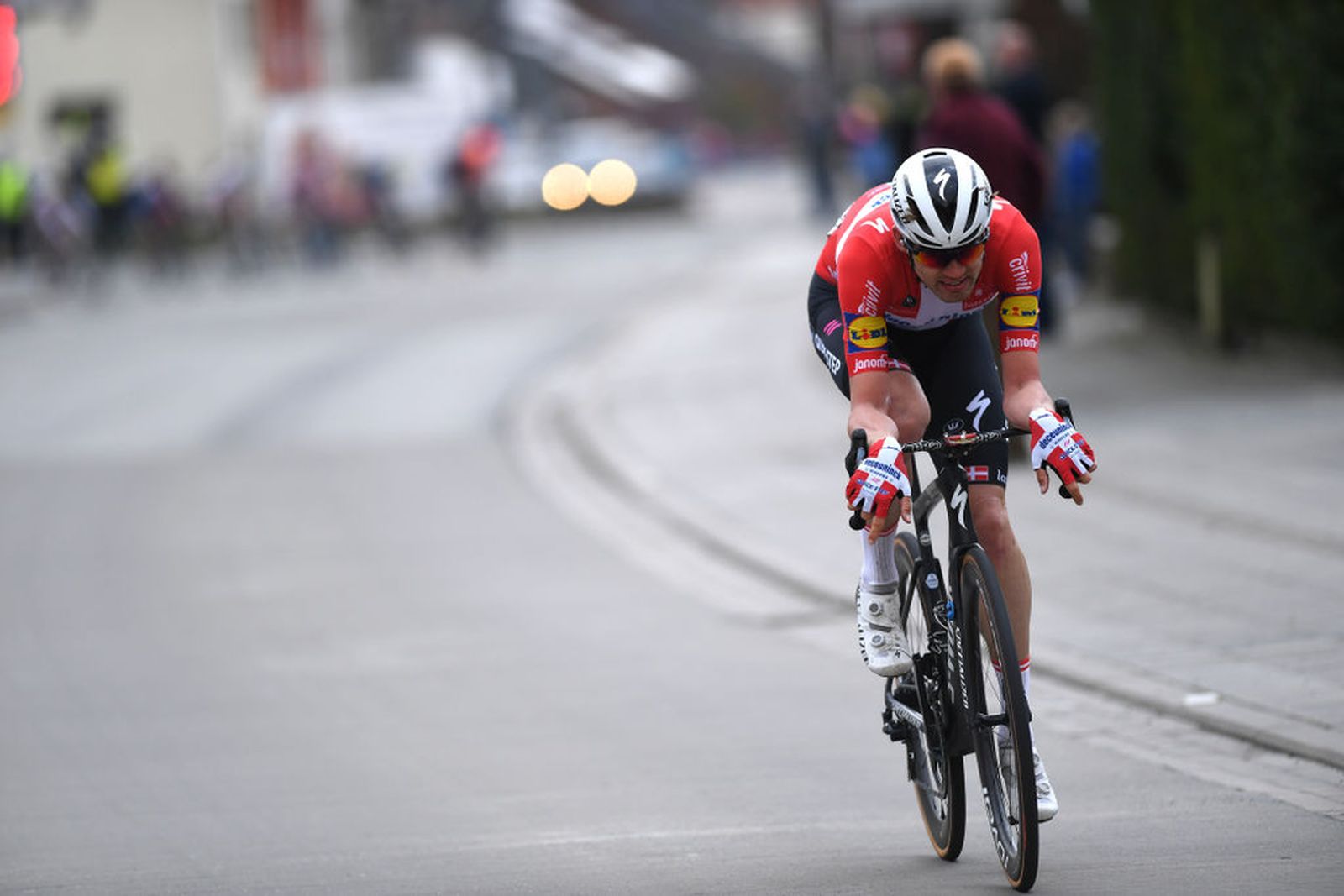 Partilha!X Campeão dinamarquês da Deceuninck-QuickStep venceu à frente de um grupo perseguidor de elite liderado por Van der Poel, ao voltar a atacar depois de mais de 50 km em fuga. Kasper Asgreen conquistou um impressionante triunfo a ‘dois tempos’ na clássica E3 Saxo Bank, na sexta-feira, atacando uma segunda vez, decisivamente, a cinco quilómetros do final, após ter estado em fuga solitária durante 54 km.PUB O campeão dinamarquês da Deceuninck-QuickStep venceu a prova à frente de um grupo perseguidor de elite, liderado por Mathieu van der Poel (Alpecin-Fenix) e que contava ainda com Greg van Avermaet e Oliver Naesen (AG2R Citroën), Dylan Van Baarle (Ineos Grenadiers) e ainda os companheiros de equipa de Asgreen, Zdenek Stybar e Florian Sénéchal, que foi segundo na corrida. (Foto Tim de Waele/Getty Images) Asgreen atacara a 66,7 km da meta, mas foi alcançado pelo referido grupo a menos de 10 km da chegada. Perante forte presença neste de corredores da sua equipa, o corredor nórdico voltou a lançar-se em fuga a menos de 5 km do final. O objetivo original de Kasper Asgreen seria o de forçar principalmente Van der Poel a gastar energia na perseguição, mas o dinamarquês encontrou força suficiente para resistir à perseguição e vencer a prestigiada clássica da Flandres, na Bélgica. (Foto Tim de Waele/Getty Images) “Eu sabia, depois do esforço na primeira fuga, que não teria chance no último quilómetro, então tinha que escapar outra vez para tentar chegar isolado se quisesse vencer a corrida. Era tudo ou nada naquele ponto”, contou Asgreen. “Tentei usar a ilha de tráfego para distanciar-me deles [o grupo de perseguidores], de modo que pudesse obter um espaço antes que pudessem reagir. Não sei se isso fez a diferença. Acho que todos tiveram um dia difícil e todos estavam no limite”, acrescentou o corredor da Deceuninck.PUB