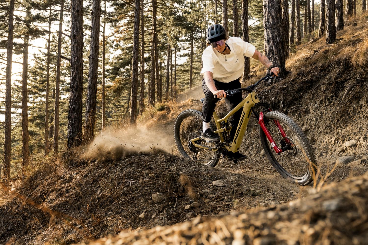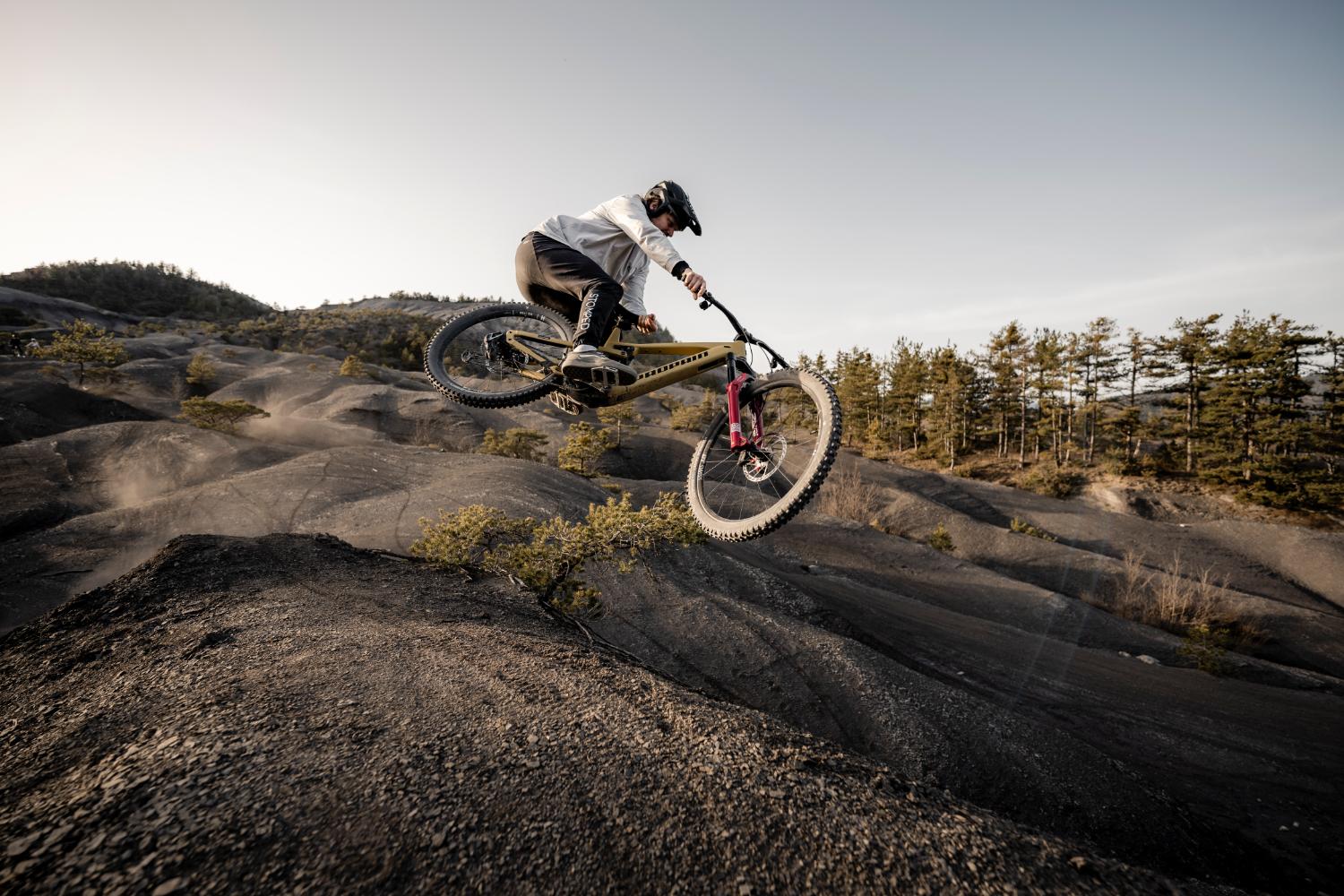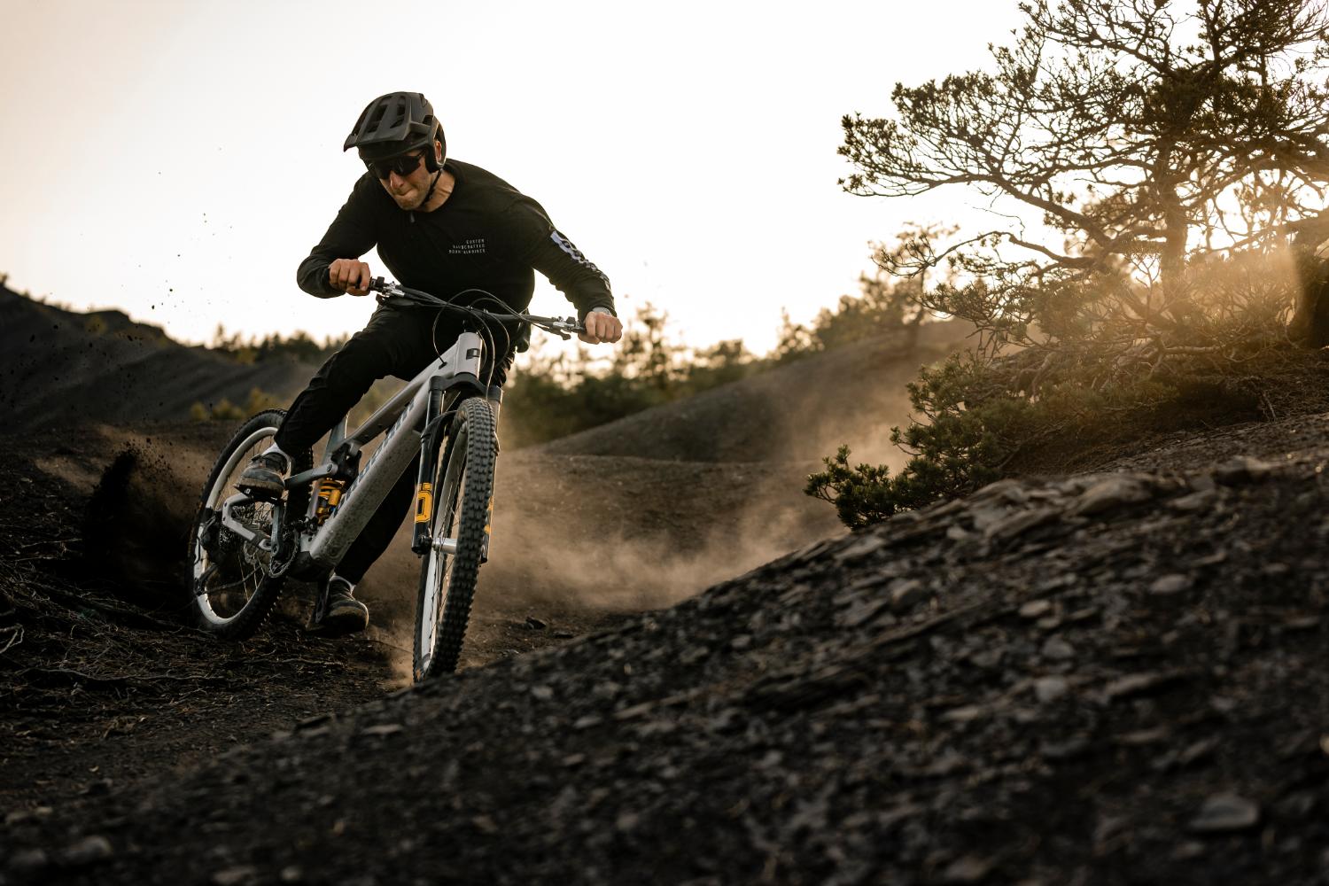 A versão Trail tem amortecimento com 160 mm de curso à frente e 150 mm atrás, podendo ser configurada com rodas 29” ou mullet. A abordagem aqui é mais polivalente, pensada para percursos longos, voltas diárias e trilhos variados, com um comportamento mais leve e previsível.