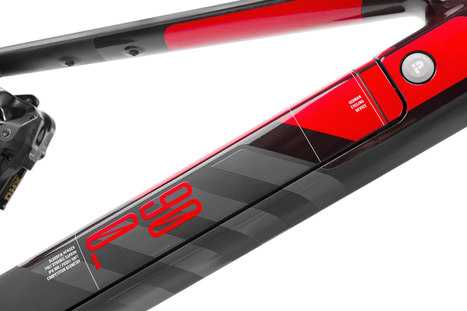 O quadro em carbono (Poly Dynamic Carbon) foi desenhado com foco na rigidez estrutural e controlo sob carga, mas também na integração total dos componentes.
