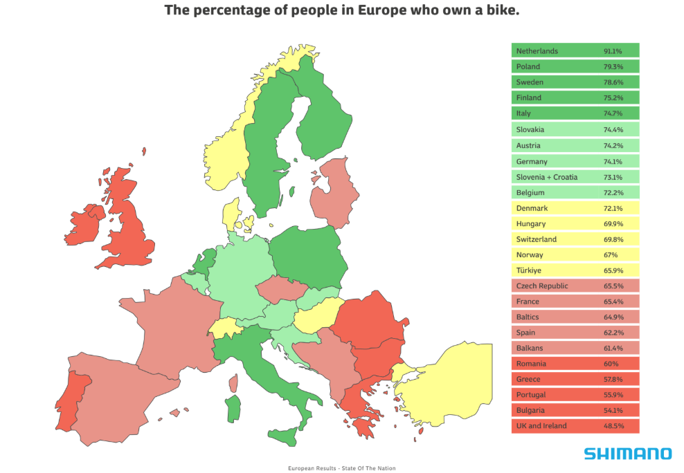 Apesar da percepção de progresso, Portugal apresenta um dos níveis mais baixos de posse de bicicleta no continente: 55,9% das pessoas afirmam ter atualmente uma bicicleta, o terceiro valor mais baixo da Europa.