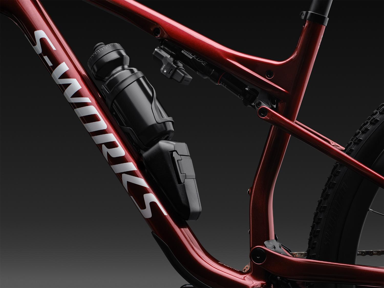 O armazenamento SWAT externo é totalmente novo, mais simples e funcional. Fica por baixo do bidon, entre os dois bidons, na verdade, e pode ser removido sem impacto no peso. Para quem compete, faz sentido.
