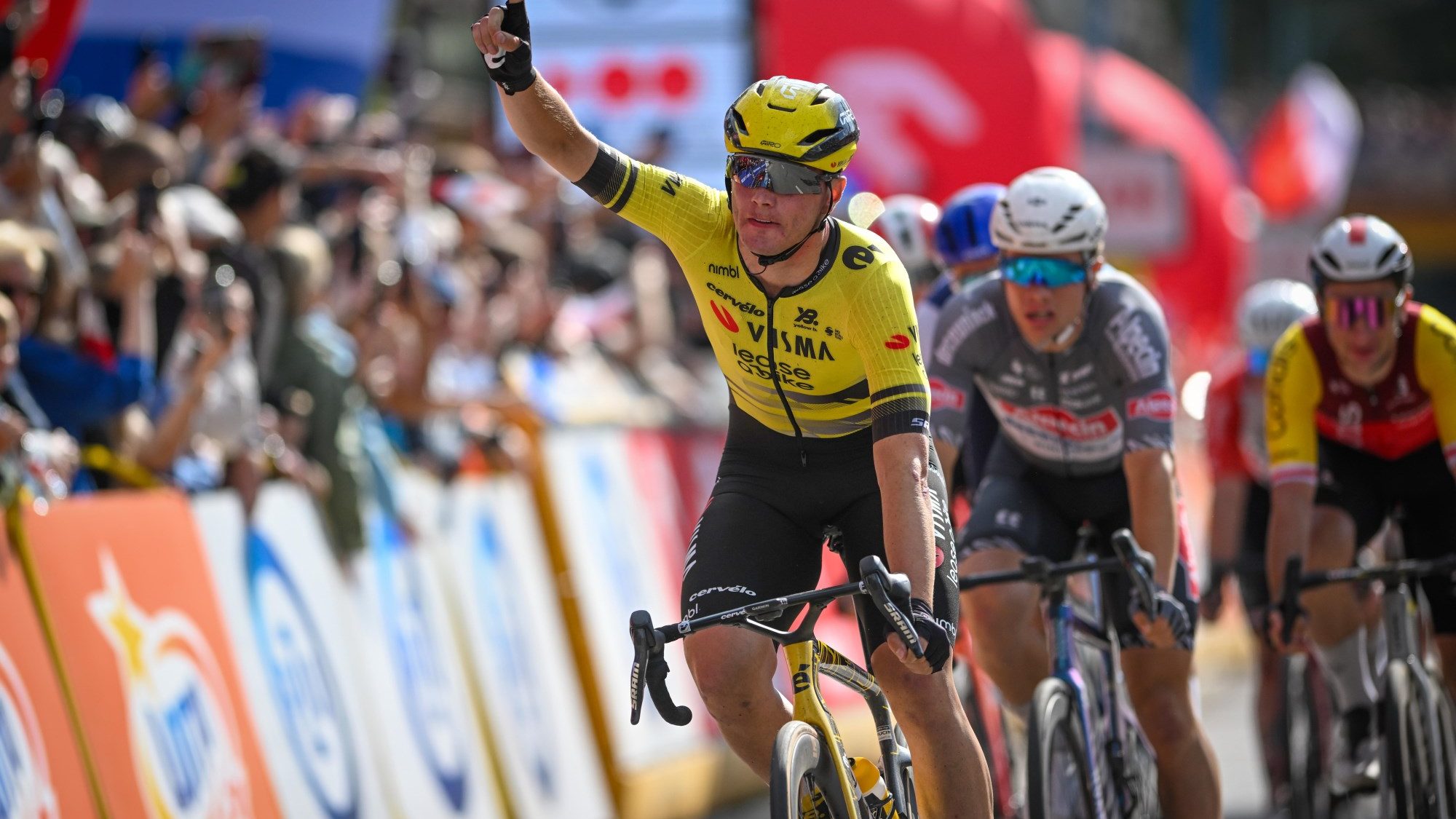 Partilha!X O neerlandês da Visma-Lease a Bike impôs-se no pelotão, à frente do francês Paul Magnier (Soudal Quick-Step). Esperava-se um sprint em pelotão na primeira etapa da Volta à Polónia, no final de quase 200 km completamente planos, e cumpriu-se, com uma primeira batalha entre os muitos velocistas em prova. PUB E entre estes, o mais rápido foi, sem surpresa, Olav Kooij. O neerlandês da Visma-Lease a Bike impôs-se no grupo, à frente do francês Paul Magnier (Soudal Quick-Step), que reagiu como um tiro nos metros finais, mas acabou por ficar um pouco atrás na linha de meta. Vencedor de duas etapas na edição do ano passado da prova polaca, incluindo a final, Kooij prolonga o sucesso nesta corrida desde 2022 (5 vitórias) e conquistou também a sua sexta vitória da temporada (incluindo duas no Giro de Itália). Bem atrás deste duo da frente, o pódio do dia completou-se com o australiano Jensen Plowright (Alpecin-Deceuninck), à frente do neerlandês Maikel Zijlaard (Tudor) e do britânico Ethan Vernon (Israel-Premier Tech). Olav Kooij assume logicamente a camisola de primeiro líder na classificação geral, com uma vantagem de dois segundos sobre o francês Donavan Grondin (Arkéa – B&B Hotels), que bonificou na fuga do dia. Kooij deverá entregar a sua camisola de líder esta terça-feira, após uma segunda etapa de relevo muito mais acidentado, com final em Karpacz. Crédito da imagem: https://x.com/vismaleaseabike/status/1952383648302297575/photo/1 PUB