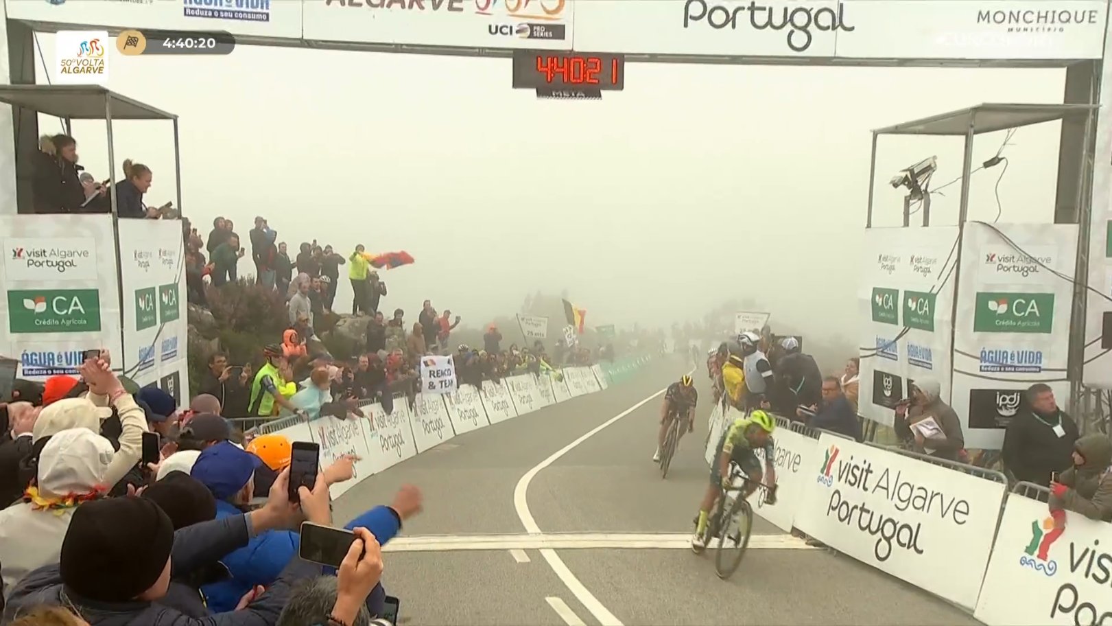 Chega então o último quilómetro, o longo troço serpenteante agora na vertente norte da Serra de Monchique, muito exposta ao vento, e a hora das decisões. António Morgado (UAE Emirates) é o único português entre os melhores. O seu companheiro Isaac del Toro não aguenta.