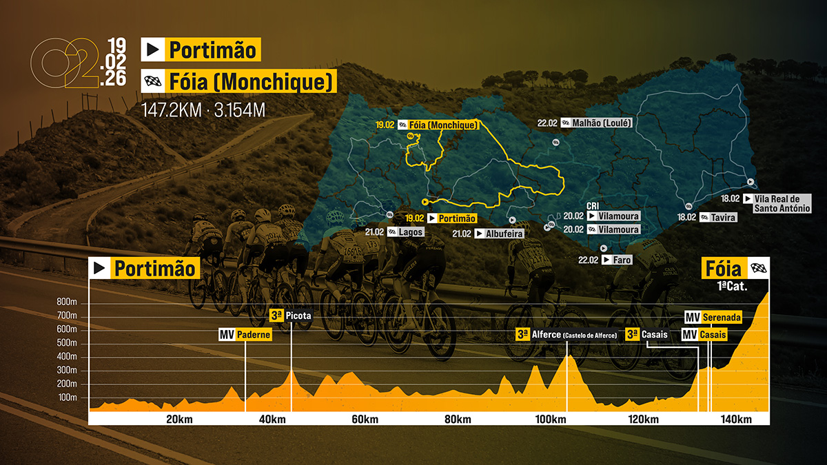 A segunda jornada leva o pelotão de Portimão até ao Alto da Fóia, na Serra de Monchique, naquela que será a primeira chegada em montanha da edição de 2026. A grande novidade está na utilização de uma subida inédita, mais exigente e seletiva, classificada como prémio de montanha de primeira categoria.