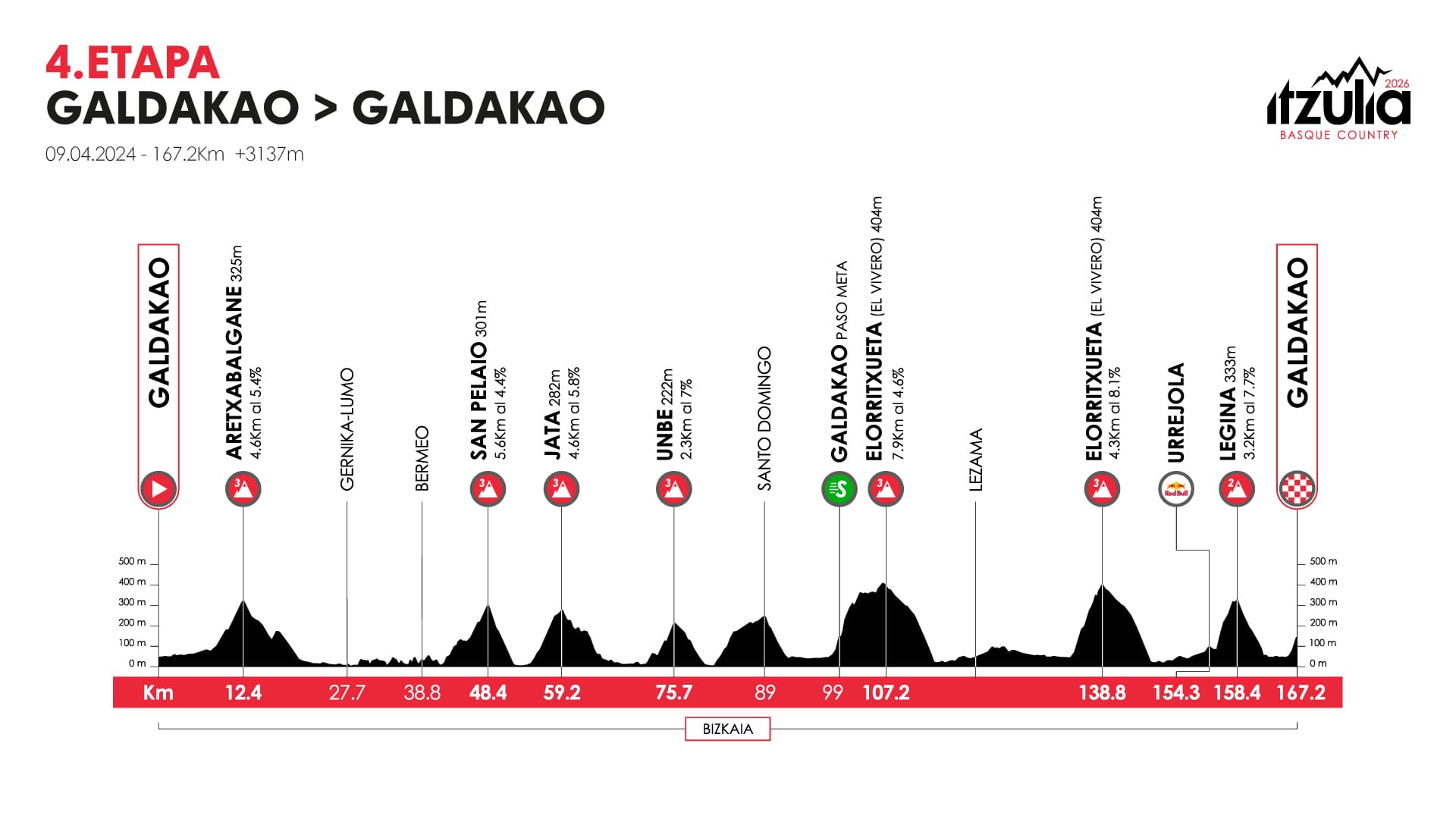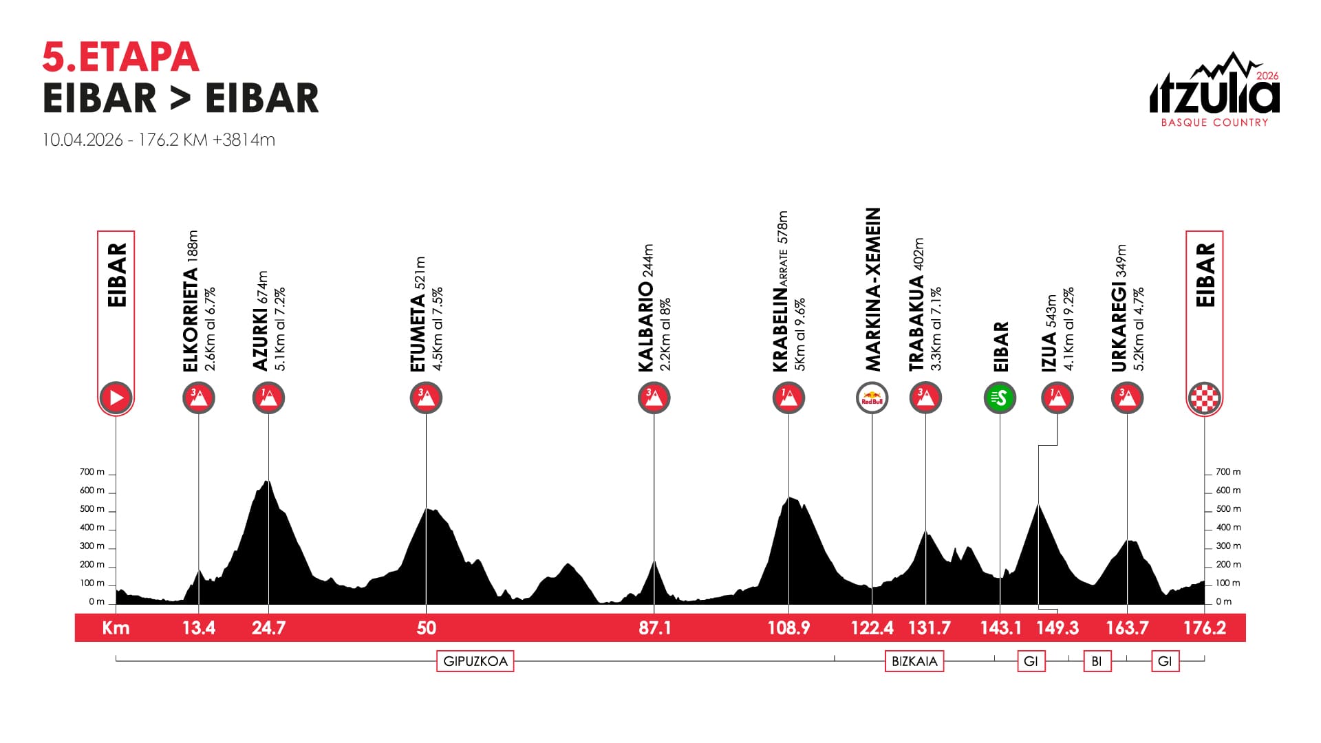 Mesmo com a corrida previsivelmente partida, ainda haverá a subida a Urkaregi (5,3 km a 4,3%), a apenas 12 quilómetros da chegada. Após a descida, os quilómetros finais em falso plano até à meta em Eibar podem ser cruciais para aumentar ou reduzir diferenças.